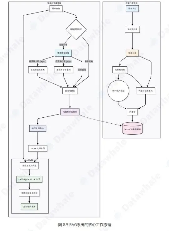 Rag主要将外部知识库先通过切分嵌入存入向量库,然后再基于查询方式返回结果。
