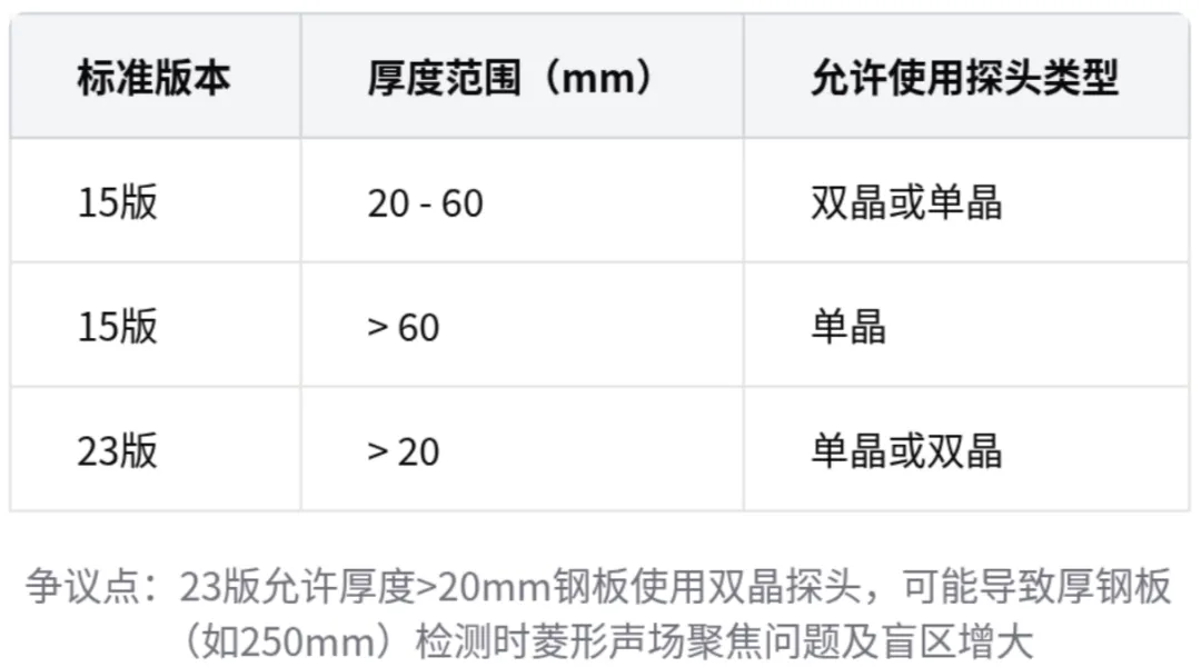 - 纵波双晶探头检测厚度应受限制,超过45mm钢板使用存在盲区漏检风险,相关标准条款存在争议