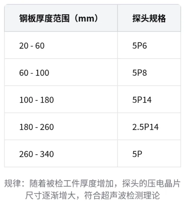 探头选择:根据被检工件厚度选择合适的探头规格,随着被检工件厚度增加,探头的压电晶片尺寸逐渐增大。如厚度 20 - 60 用 5P6,60 - 100 用 5P8,100 - 180 用 5P14,180 - 260 用 2.5P14,260 - 340 用 5P。