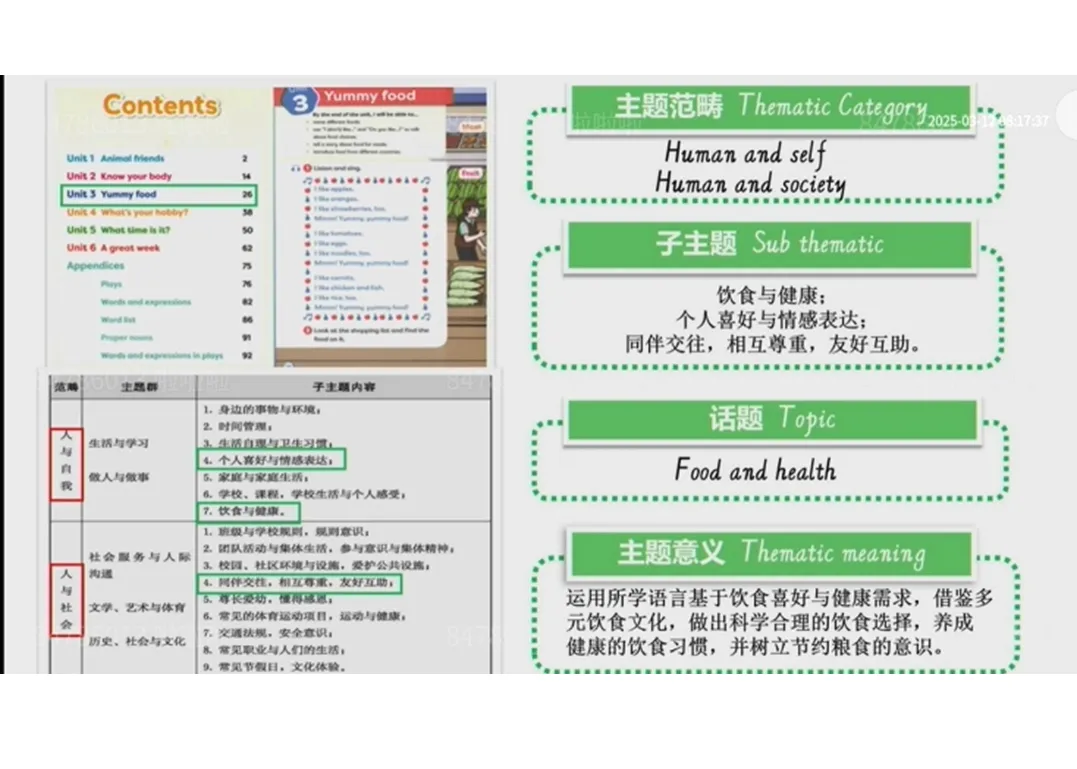 3.主题意义:引导学生运用食物相关语言,结合饮食喜好与健康需求,了解多元饮食文化,做出科学膳食选择,养成健康饮食习惯,树立节约粮食的意识。