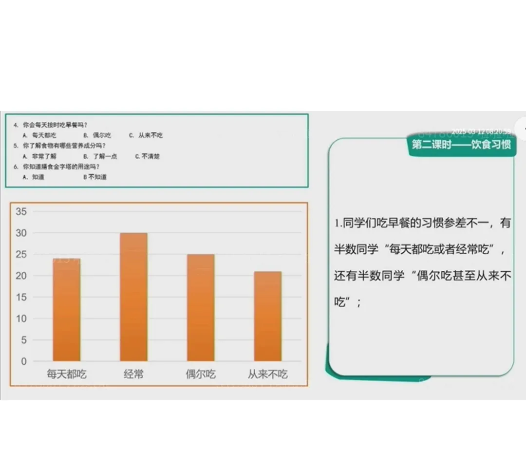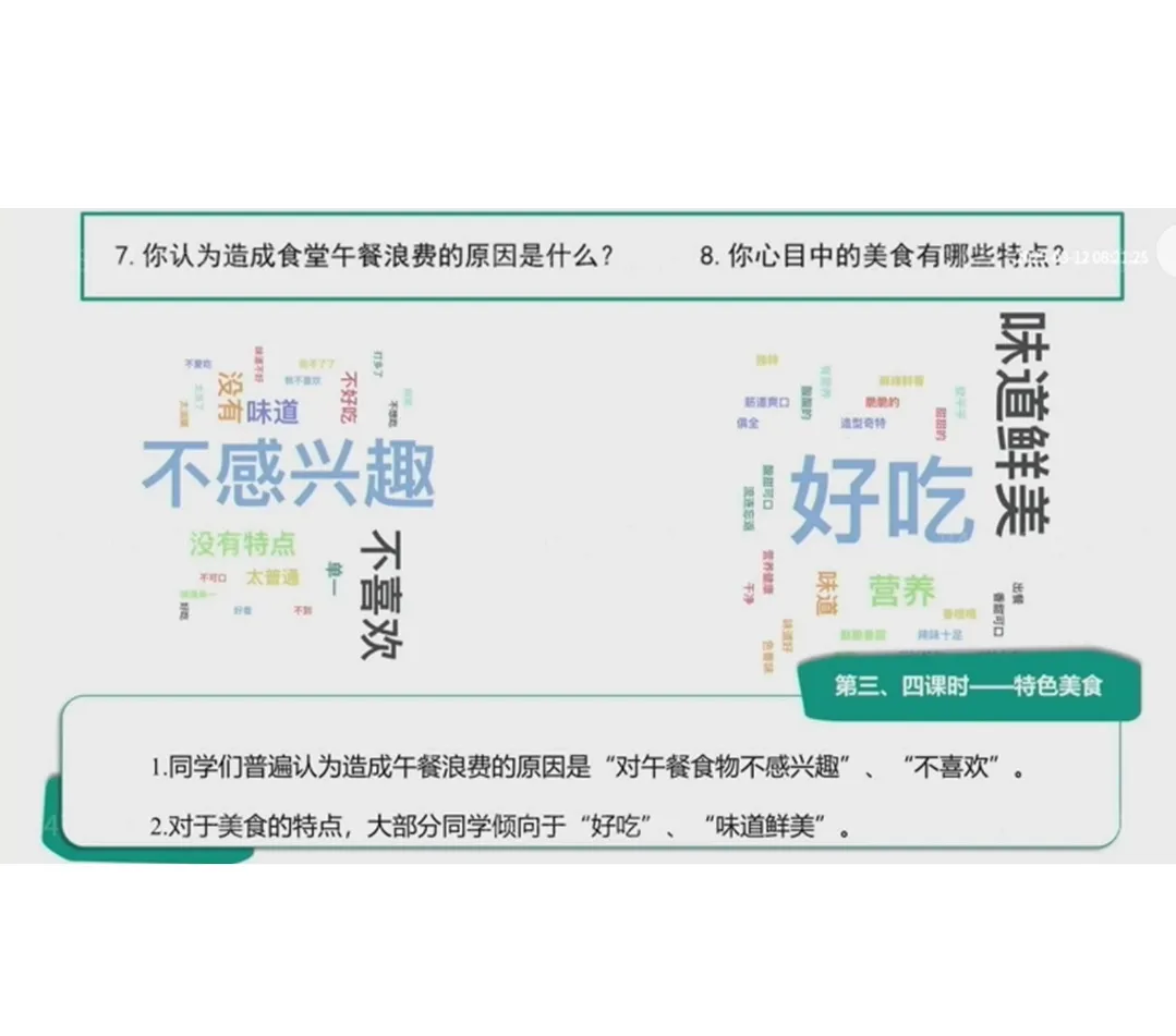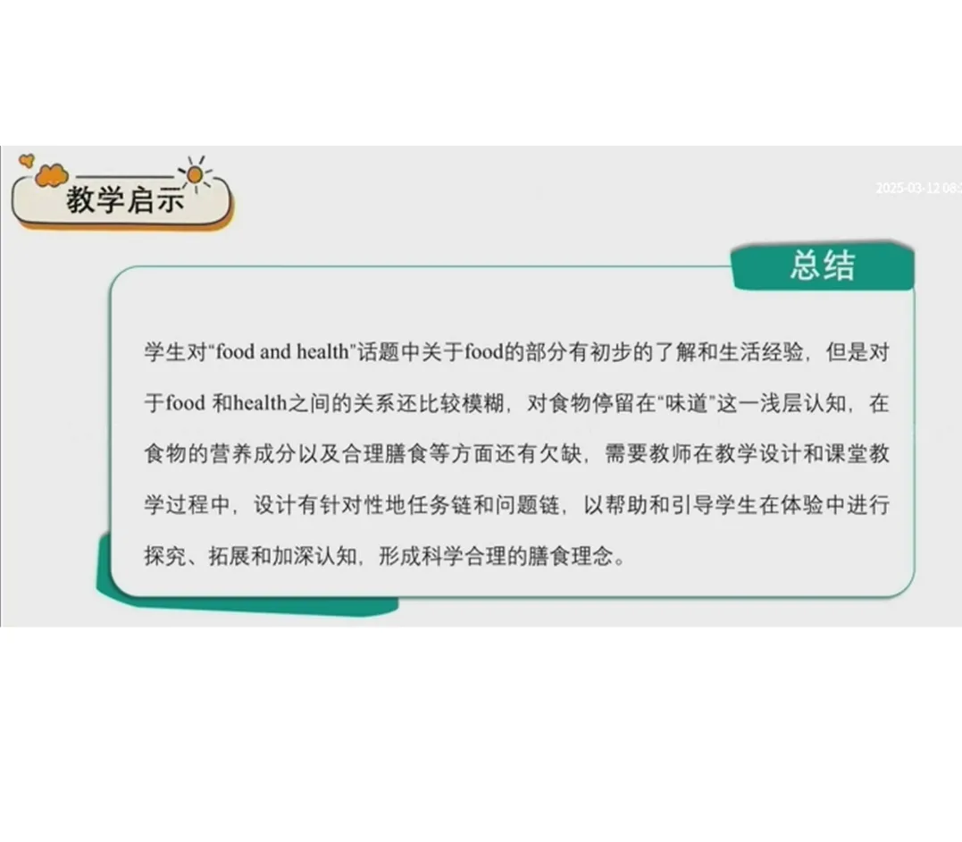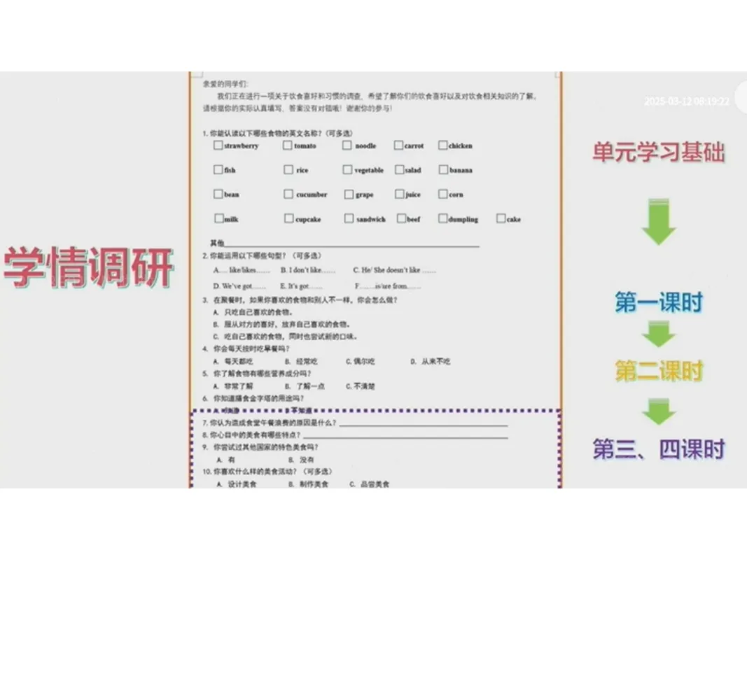结合调研结果,我们明确了教学方向:学生对“食物” 有生活经验和浅层认知,但食物与健康的关联模糊,仅关注味道,缺乏营养、膳食搭配的认知。因此,本单元需设计任务链 + 问题链,让学生在体验中探究,逐步建立科学的膳食理念。
