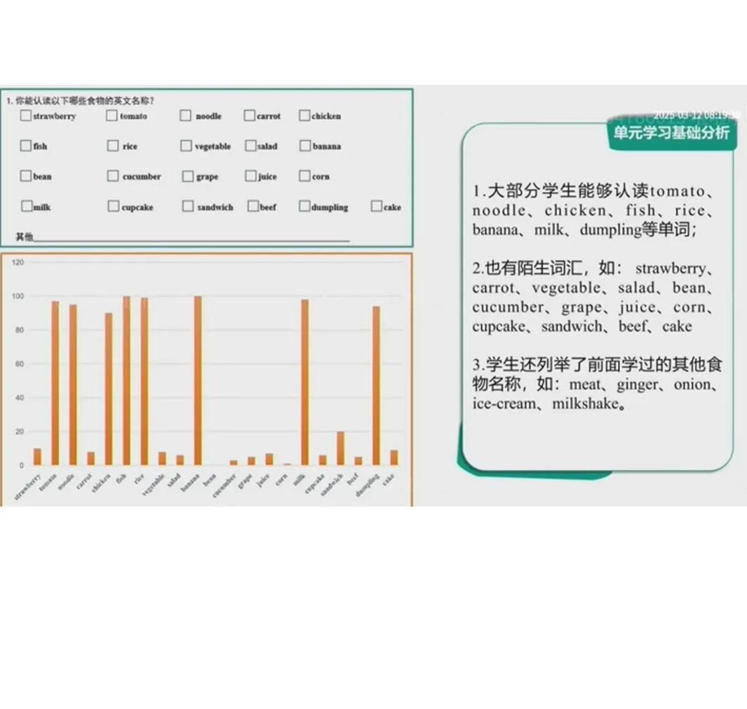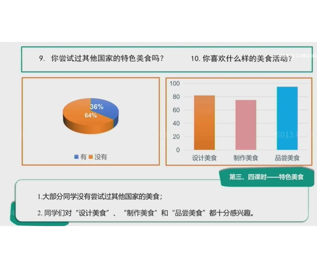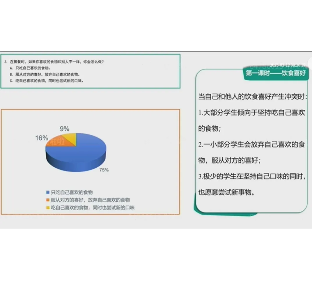 结合调研结果,我们明确了教学方向:学生对“食物” 有生活经验和浅层认知,但食物与健康的关联模糊,仅关注味道,缺乏营养、膳食搭配的认知。因此,本单元需设计任务链 + 问题链,让学生在体验中探究,逐步建立科学的膳食理念。