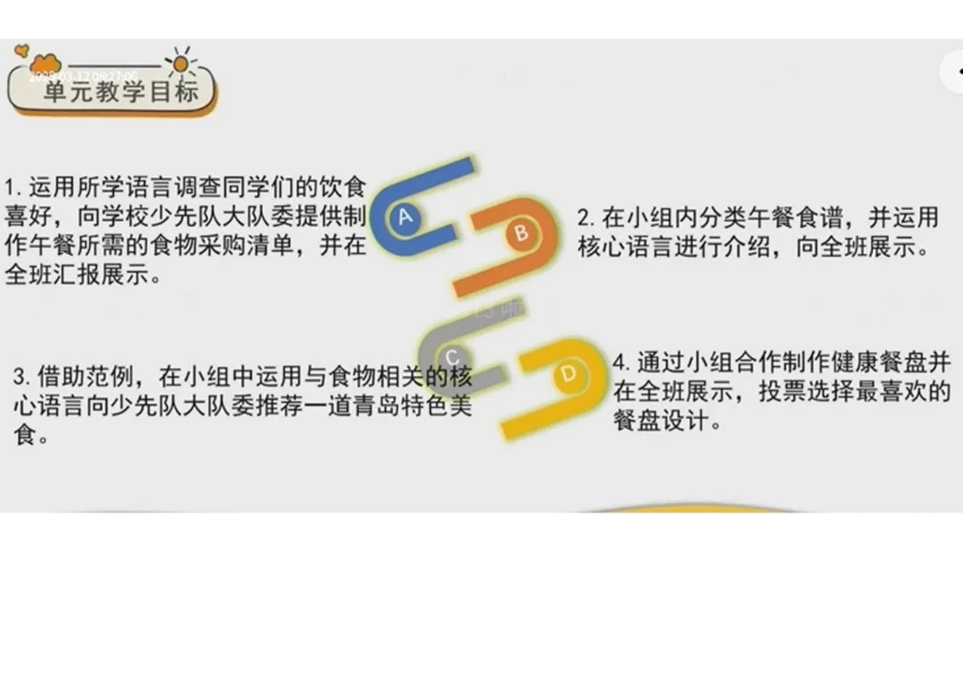 1.Goal(目标):运用食物词汇与句型,结合健康需求设计午餐,向少先队大队委推荐,养成健康饮食、节约粮食的习惯;