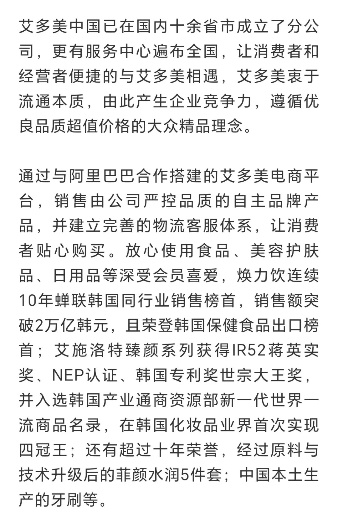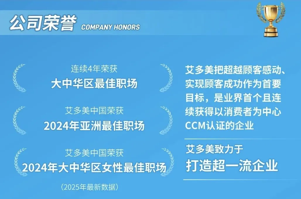 艾多美把超越顾客感动,实现顾客成功作为首要目标,是业界首个且连续获得以消费者为中心CCM认证的企业。同时艾多美致力于打造超一流企业,总部连续三年荣获“亚洲最佳职场”称号,艾多美中国,荣获“2024年亚洲最佳职场”称号,连续三年获得“大中华区最佳职场”称号。