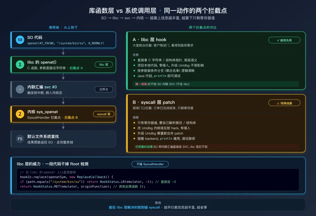 例外:当默认 syscall 行为不对(语义偏差,第九篇类型三),且修 syscall 不方便时,可以在这一层 hook。