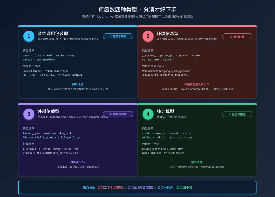 - 分清四类库函数 —— 包装型不用动、环境型必须 hook、外部型补虚拟模块、纯计算型几乎不碰
