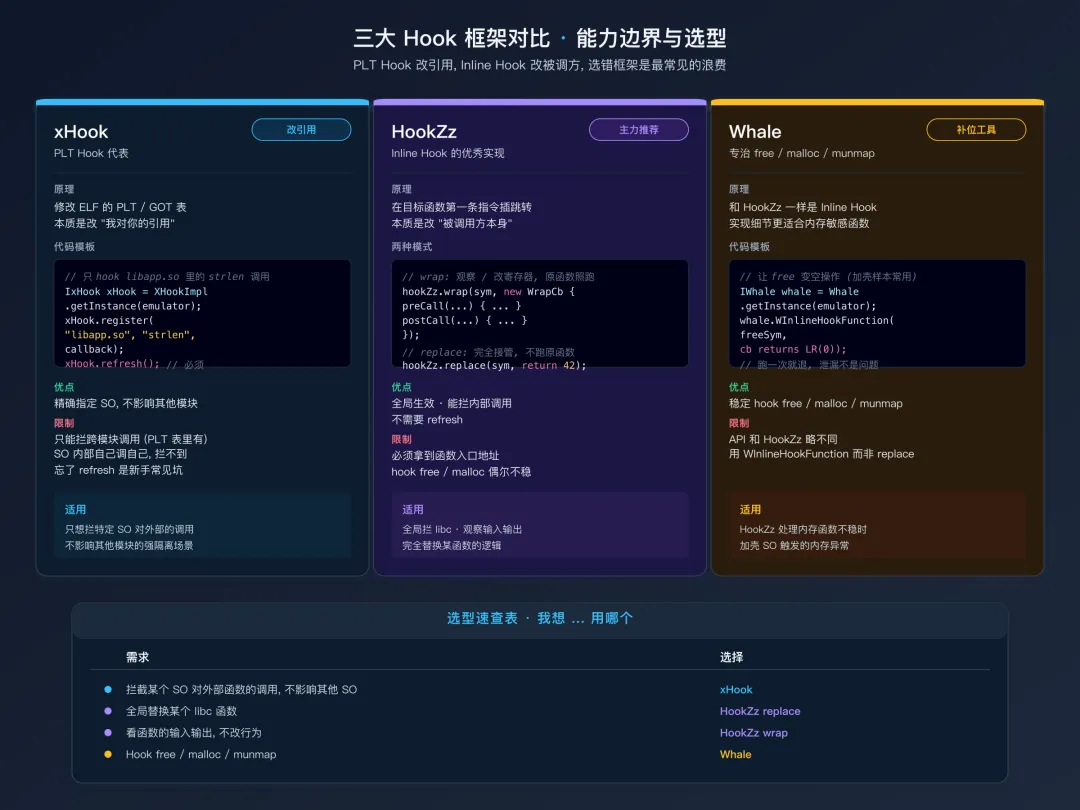 - xHook 拦跨模块调用,HookZz 改全局函数,Whale 处理内存 —— 选错框架是最常见的浪费