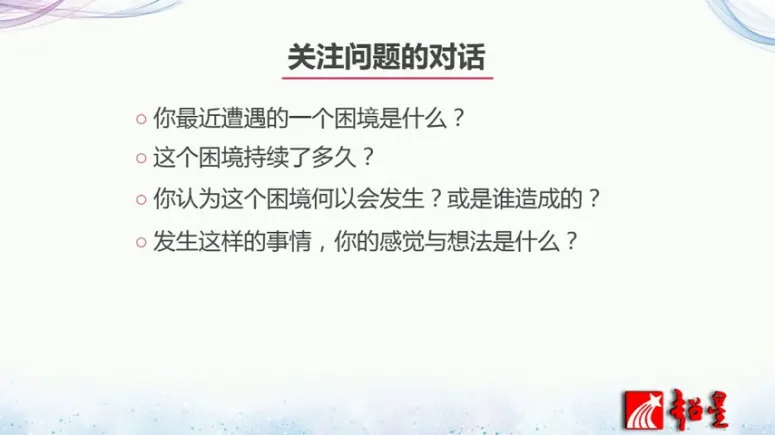最后我们来讲一下成就,一个人怎么样才能会有更高的成就呢?其实在于他处理问题的这种方式。在处理问题的时候呢我们有两种方法,一个是聚焦于问题的,一种是聚焦于解决的。那么最聚焦于问题的是什么样?我们来看一看关注问题的对话会是什么?会是什么样的?比如说我问大家7个问题,大家可以尝试回答一下,第一个你最近遭遇的一个困境是什么?