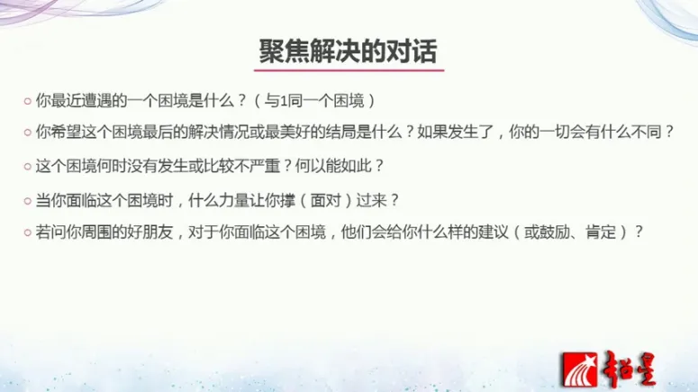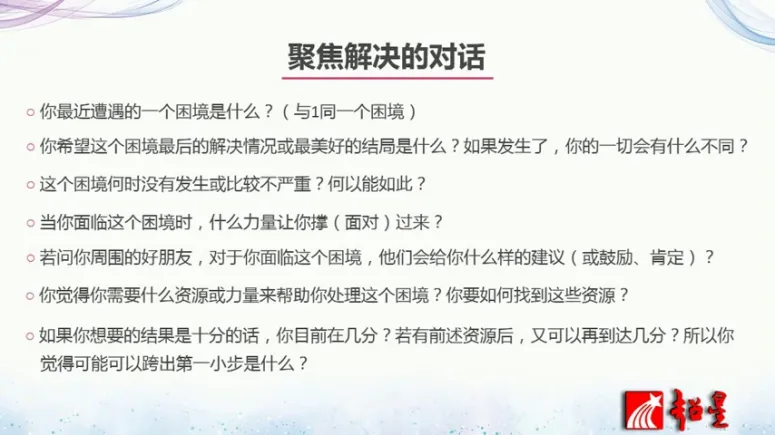 第七,如果你想要的结果是10分的话,目前大概可以在几分?如果前面的资源都具备的话,又可以达到几分?你觉得可以目前可以走的一小步到底是什么?可以让你去解决这个问题,这就是聚焦解决的对话。那么问完这7个对话以后,我相信大家会至少会知道有一些思路帮助你来解决这个问题,也就知道可以采取马上采取的一小步是什么。当你采取这一小步的时候,你的负面情绪会减少,正向的这感觉就会提升,好问题慢慢慢慢就得到解决。