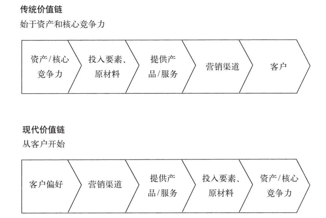 传统价值链的出发点是企业的核心竞争力,即企业资产。然后,价值链会走向投入要素和原材料,其后是产品和服务、营销渠道,最后到达客户。这一价值链从资产开始,然后一路将资产转化为对客户极为重要的产品和服务