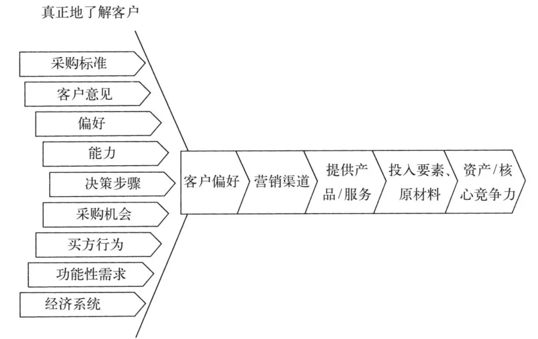 以客户为中心的思想,其出发点是客户,最终目的地是资产和核心竞争力。以客户为中心的思想关注客户的需求和偏好,致力于为客户的需求和偏好寻找最好的选择方式