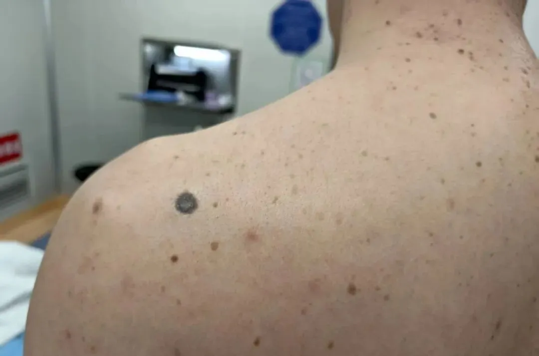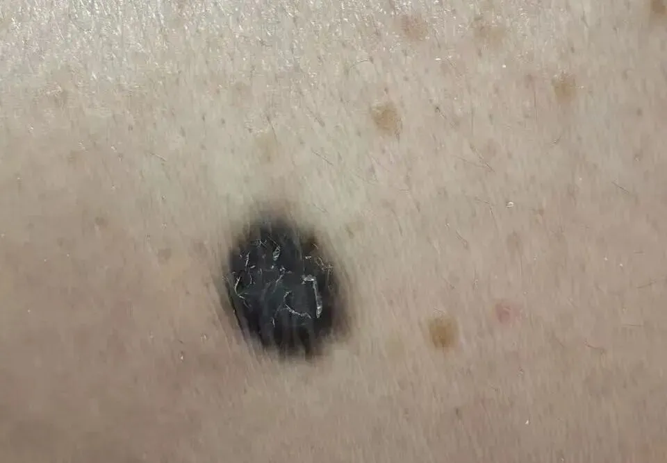 皮肤科检查:右侧肩背部可见1.0cm*0.75cm黑色斑,轻度萎缩,边界较模糊,可见少了脱屑,触摸时可见轻度凹陷,萎缩。
