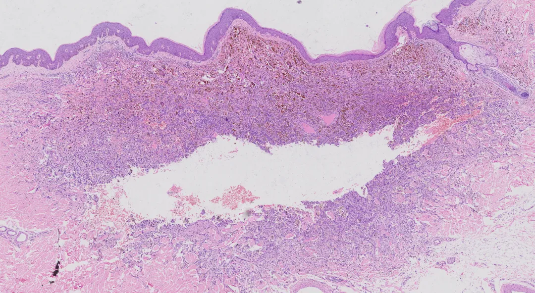 角化过度,表皮增生肥厚,皮突延长,肿瘤位于真皮内,排列较紊乱,肿瘤中央可见出血性裂隙,真皮乳头部可见无浸润带。