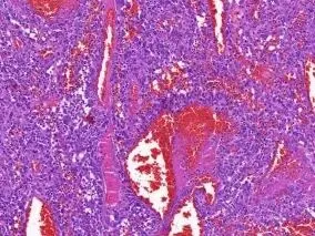 ①肿瘤组织内有不规则的类似于血管腔的出血性裂隙。