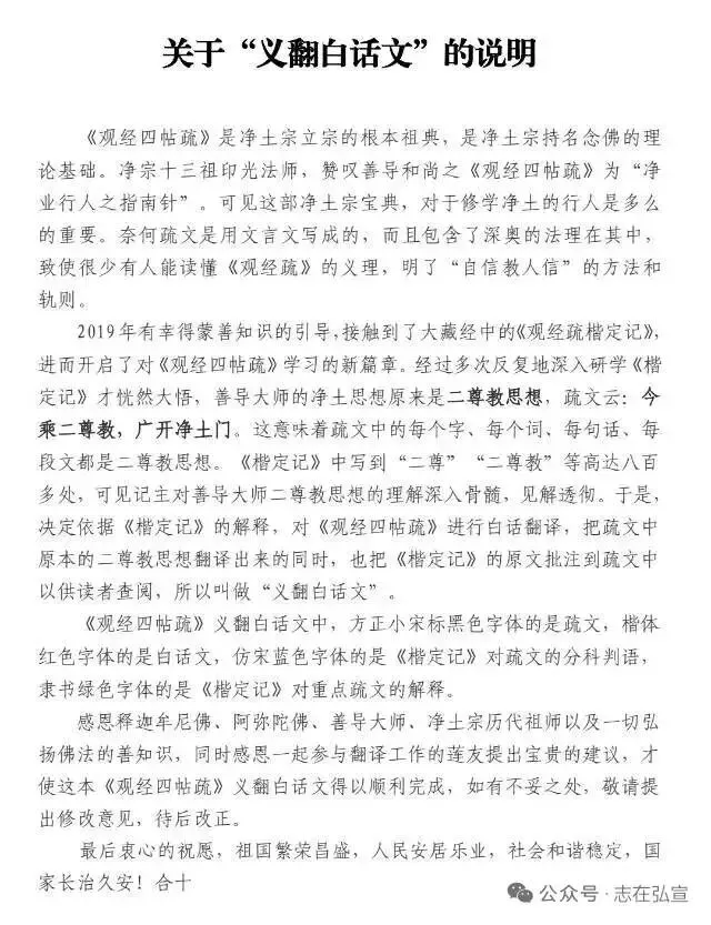 39《四帖疏》义翻白话文何以得知?次下文中说言“诸佛如来有异方便,令汝得见” ,次下日想、水想、冰想,乃至十三观以来,尽名异方便也。 怎么知道是劝修后面“方便观法”的序言呢?“见彼国土极妙乐事,心欢喜故,应时即得无生法忍”此句接下来的经文说,“你是凡夫,心想羸劣,未得天眼,不能远观极乐。诸佛如来,有能通入弥陀别意弘愿的神力方便,让你在光台中亲眼得见”,然后,下面才正式开讲日想、水想、冰想乃至整个十三观,把光台所见开说出来,全都是能通入弥陀别意弘愿的释迦教力方便。如此一来,就清楚明了了,序分定善示观缘初,的确是作为引导劝修“方便观法”的序言。(教力义通十六观) 欲使众生于此观门一一得成,见彼妙事,心欢喜故,即得无生。 为了使众生,通过闻修此“方便观门”之教,生起愿生极乐之心(释迦时),见住立空中之佛,心生欢喜,即悟无生法忍。(弥陀时)斯乃直是如来慈哀末代,举劝励修,欲令积学之者无遗圣力冥加现益故也。 此问“见彼国土极妙乐事,心欢喜故,应时即得无生法忍”之义, 正是世尊,慈悲哀悯未来世一切善恶凡夫,预先举出了,修观成就所得的无上真实大利,用以劝勉、鼓励、闻修“方便观门”之教,以令精进修学的人,得到二尊暗中加持,由观门教起愿生心,最终契入弥陀别意之弘愿,各个都得到无生法忍的利益。(心中确信自己往生决定) 证曰:掌握机系,十有三结,条条顺理,以应玄门。讫此义周,三呈前证者矣。 梦中圣证:释迦佛说此《观经》十三观文,观观随顺相应无量寿法佛智玄门。只要以一心信乐愿生之心为手,握持二尊无碍智慧之炬,决定能由观门教起愿生心,最终契入弥陀别意之弘愿,得到往生决定之无上真实大利。至此,第七得益门玄义解释完毕,《疏》末三夜灵相,彰显此门所说不谬。 上来虽有七段不同,总是文前玄义。料简经论相违妨难,一一引教证明,欲使信者无疑,求者无滞,应知。 以上,从第一序题门到第七得益门的七段不同解释内容,总的属于解释经文前,依《观经》梳理而出的幽深义理。融会疏通此经所为之机、行、得益,与他经他论看起来矛盾实际并无矛盾的地方,一一引圣教以为明证,消除“自力”的执情,建立“他力”的信心,一心信乐,求愿往生,上尽一形,下收十念,见酬因身,生真报土,二尊教宗一致,无二无别,凡夫念佛直入佛家,应该这样来信受玄义分之意。