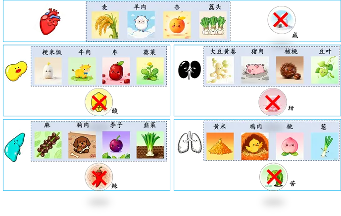 五禁:肝病禁辛,心病禁咸,脾病禁酸,肾病禁甘,肺病禁苦。——《灵枢·五味》