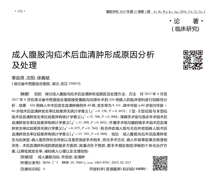 章由贤, 沈阳, 徐瀚斌. 成人腹股沟疝术后血清肿形成原因分析及处理[J]. 腹部外科, 2019, 32(02): 132-135.
