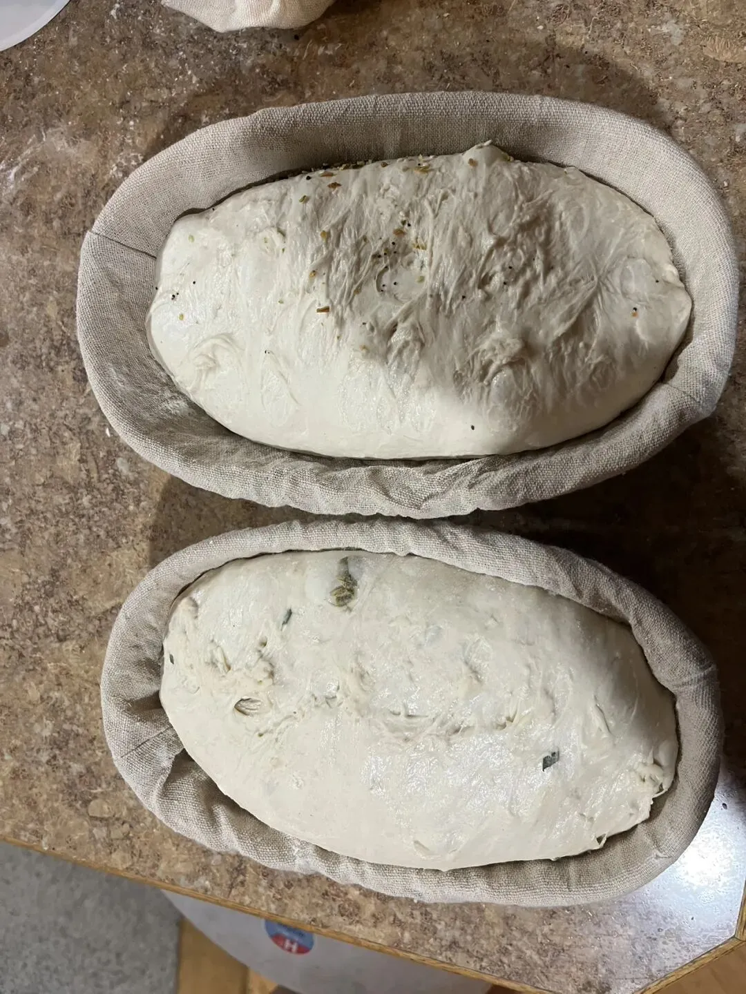 我最近又做了两次欧包,主要是我新买了椭圆形的藤蓝,想试一下不同形状会不会不一样。因为圆形藤蓝只有中心位置是最高点,我感觉之前的面包在顶部总是很dense,椭圆形的藤蓝面团分布更均匀,这是我的assumption,不知对不对,所以试一试。