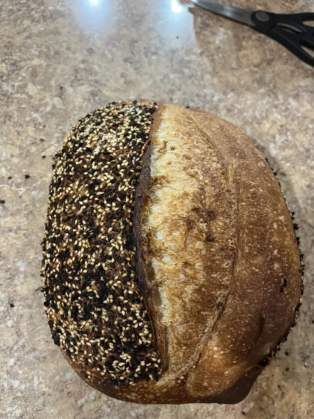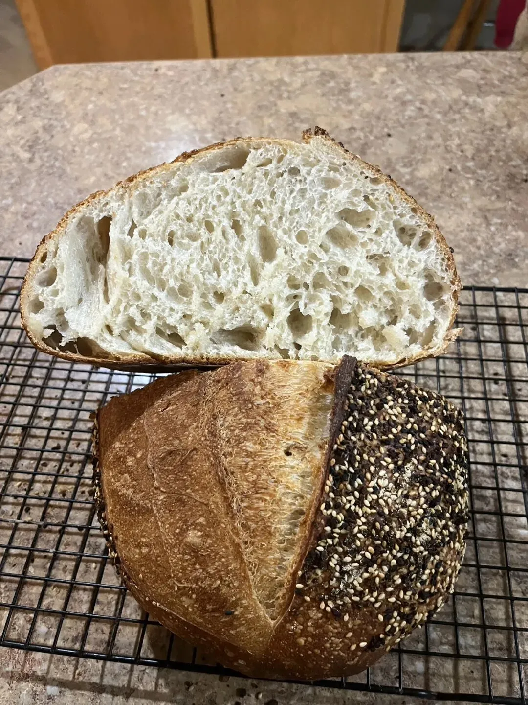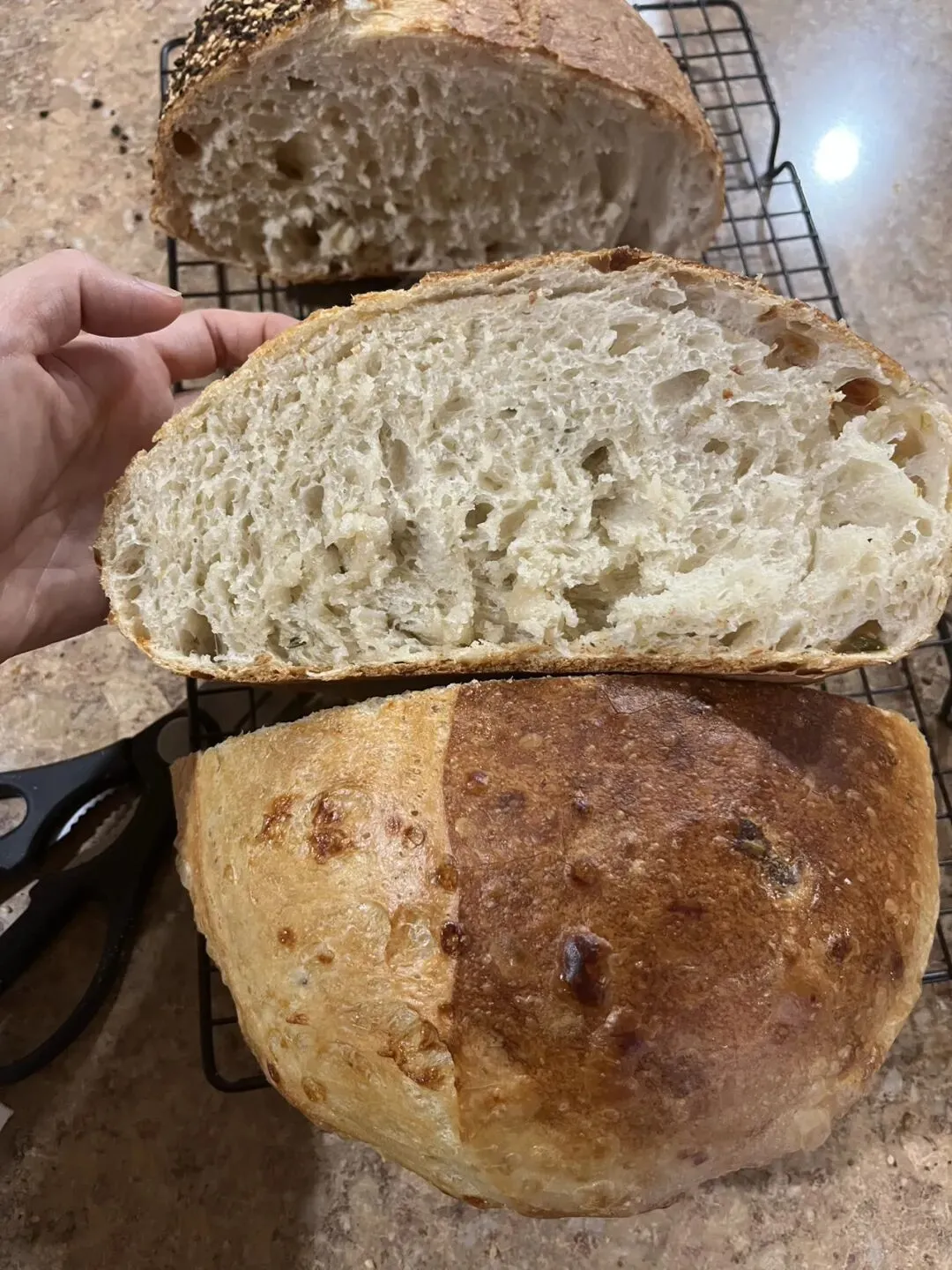 这个是在放入藤蓝之前,在表面喷水,拿起面团在贝果的everything里滚一下,再放入藤蓝,于是表面就有风味。这个是在第二次折叠的时候,加入mozzarella 奶酪丝,墨西哥辣椒碎和迷迭香碎,加入料的面团比纯面团更不粘手,这是我没预料到的。这个面包也是在铸铁锅里烤的。这两次都是直接在铁板上烤的外形更好,有个小耳朵,耳朵越往外翻说明oven rise更好,我可能以后会放弃用铸铁锅,清洗也麻烦。毕竟铸铁锅只是帮助形成密闭的空间,再烤之前会加入几个冰块,帮助形成蒸汽,这个open baking也能做到。