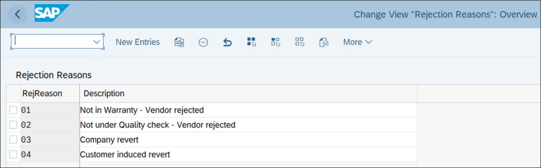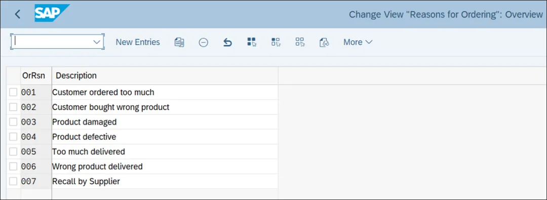 在此配置中,将定义 ARM 流程的编号范围。要进入此配置步骤,请执行事务代码 SPRO,然后导航至“物料管理”•“采购”•“采购订单”•“退货订单”•“高级退货管理”•“定义高级退货流程 ID 的编号范围”。下图展示了为 ARM 流程定义的编号范围。您可以通过执行事务代码 SNRO 直接进入此配置步骤。在此配置步骤中,可以针对编号范围对象 MSR_ID 定义内部和外部编号范围。基于此配置,系统会为每一个通过使用特定文档类型创建退货采购订单而启动的 ARM 流程分配一个唯一的编号/ID,以跟踪整个端到端流程。在此配置中,您可以根据业务需求定义供应商退货的原因。要进入此配置步骤,请执行事务代码 SPRO,然后导航至“物料管理”•“采购”•“采购订单”•“退货订单”•“高级退货管理”•“定义供应商退货原因”。可以在退货采购订单抬头的“退货”选项卡中输入退货原因。当发送退货采购订单时,此信息将发送给供应商。下图展示了退货原因的定义。点击“新条目”按钮,根据业务需求定义您的退货原因。定义一个四位数的退货原因代码(OrRsn)并输入描述。在此配置中,您可以根据业务需求定义供应商退货的拒收原因。要进入此配置步骤,请执行事务代码 SPRO,然后导航至“物料管理”•“采购”•“采购订单”•“退货订单”•“高级退货管理”•“定义供应商退货拒收原因”。下图展示了拒收原因的定义。点击“新条目”按钮,根据业务需求定义您的退货原因。定义一个两位数的拒收原因(RejReason)代码并输入描述。可以在退货采购订单抬头的“退货”选项卡中输入拒收原因。这发生在创建退货采购订单后,由于法规、公司政策或合规性问题,供应商拒绝退货的情况。当在退货采购订单中更新拒收原因时,系统将停止进一步处理退货。你若喜欢,点个❤️谢先👇