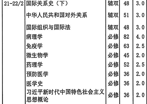 这个时期,在内容跨度上,大概包括了公共必修课(比如高等数学、中国近代史纲要)、部分医学必修课(比如生理学、人体解剖学)和「第一个」双学位学期的外交学必修课(比如国际关系史、国际政治概论)。