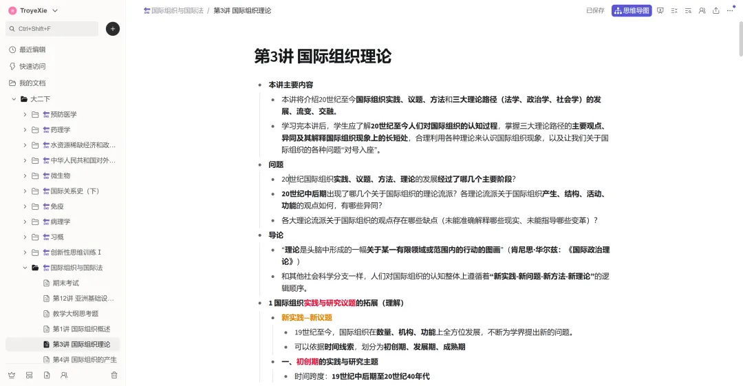 在这之前,我的笔记倾向于全文整理,一种更适用于国际关系这类社科课程学习的方法,这种方法强调毫无遗漏地把课件里的「每一个字」、包括老师上课的说的「每一个字」都恨不得整理、归纳进笔记里,这种方法对于社科的适用性在于,社科课程题目的回答往往需要「触类旁通地展开」,“没有标准答案”本身就意味着只要阐述合理即可,就比如一个国际关系的名词解释,比如“三十年战争”,除了发生时间的具体年份,几乎没有一个限定的框架去回答它。
