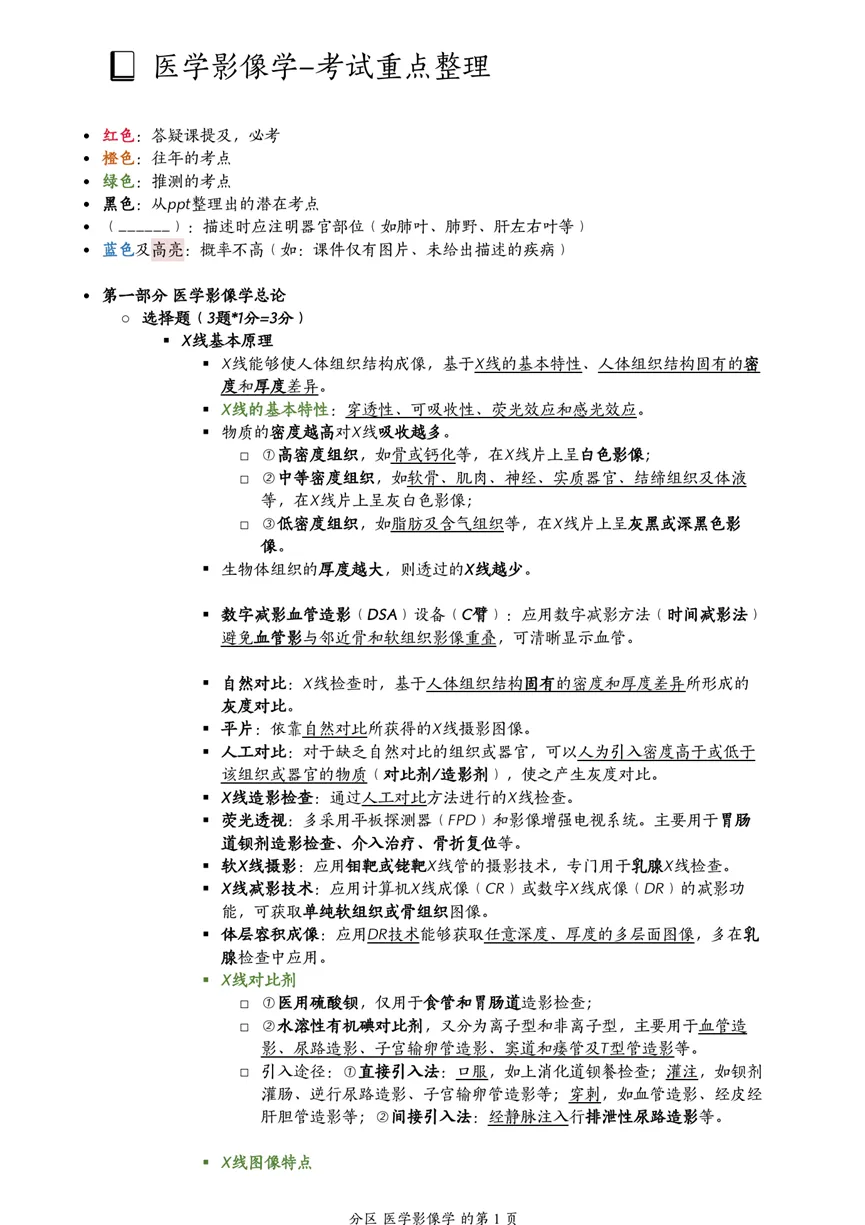 《医学影像学(2023秋)》的课程笔记,第一次用把知识和色彩结合在一起
