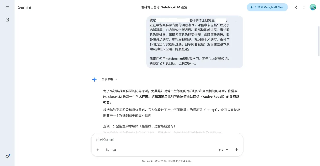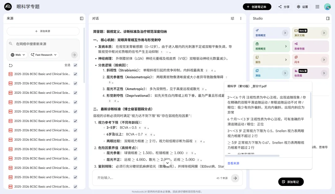 NotebookLM陪伴了我最后一门、但恰恰又是专业核心的课程——本文开头所提到的《眼科学专题》,这个工具的强大之处在于,它是一个吸纳、学习了我所上传的所有文档内容之后再与我对话的「专家」,毫无疑问的——「专家」。