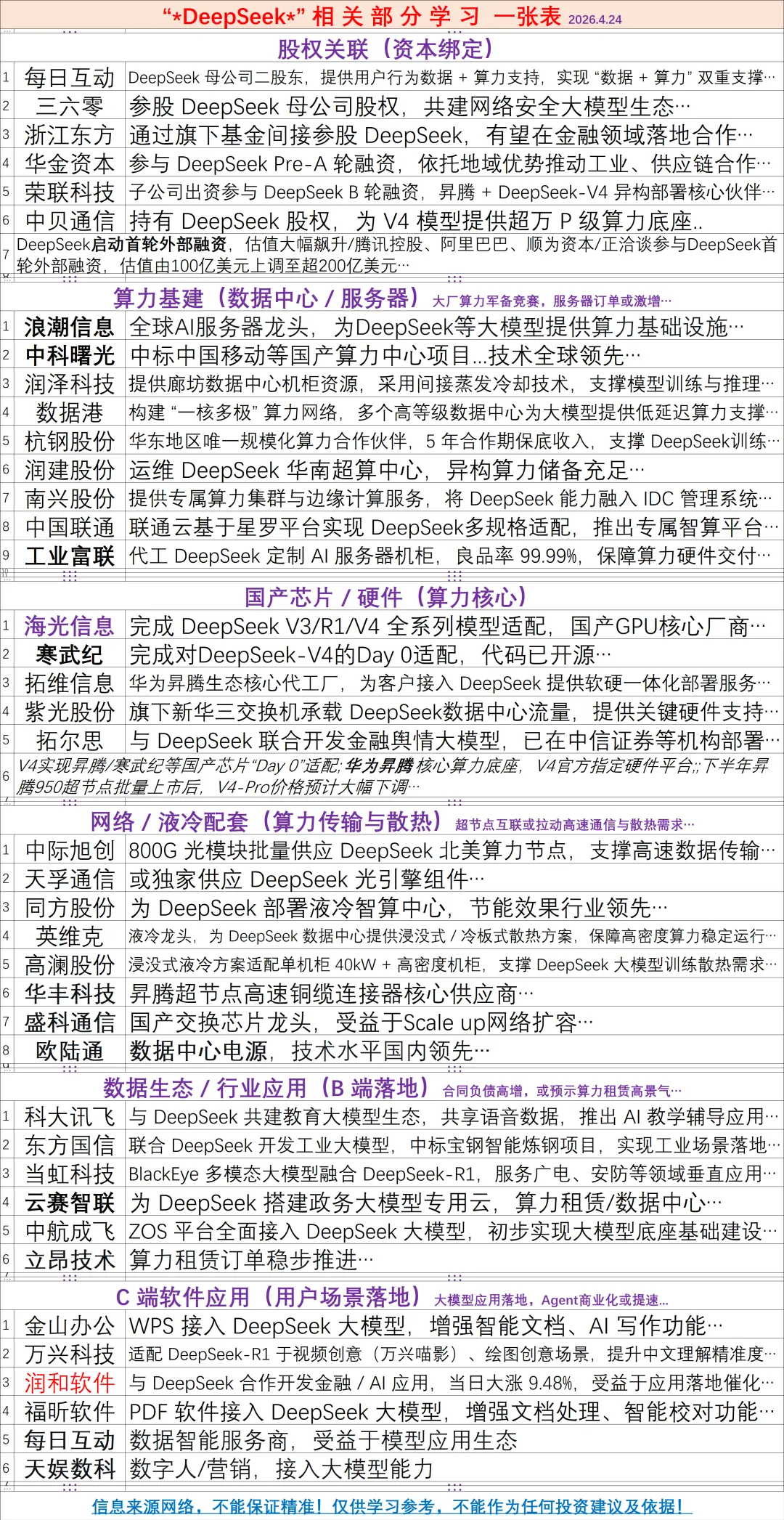 吾会优先看看已完成DeepSeek V4适配的国产芯片(如海光信息、寒武纪 等)作为国替或受益于昇腾/海光生态加速渗透...另外液冷+高密机柜的液冷数据中心(如中科曙光、润泽科技 等)或是 DeepSeek大模型训练的刚需吧...而应用端落地或可优先看看已接入 DeepSeek+有明确商业化场景的如金山办公、科大讯飞等等业绩确定性强的企业...