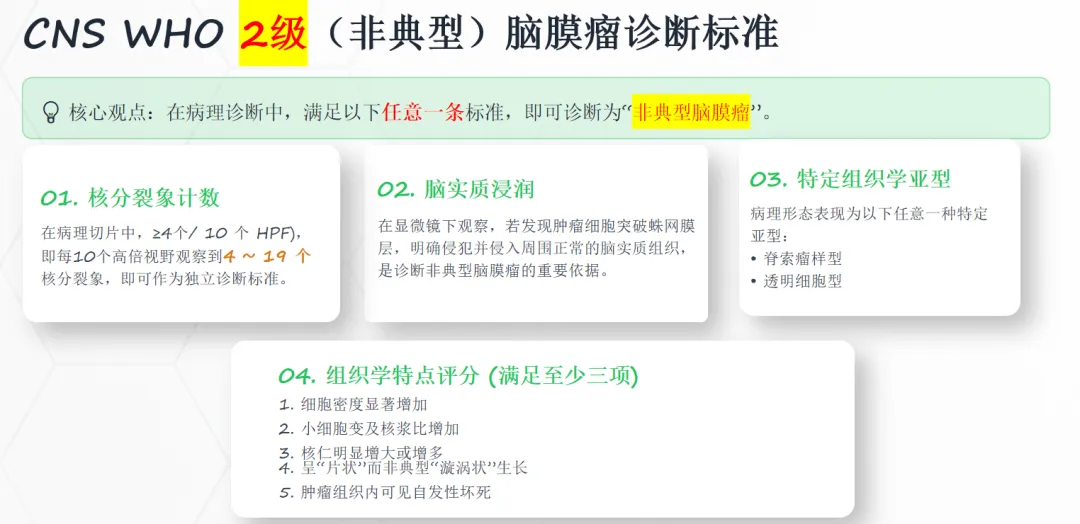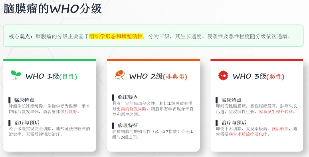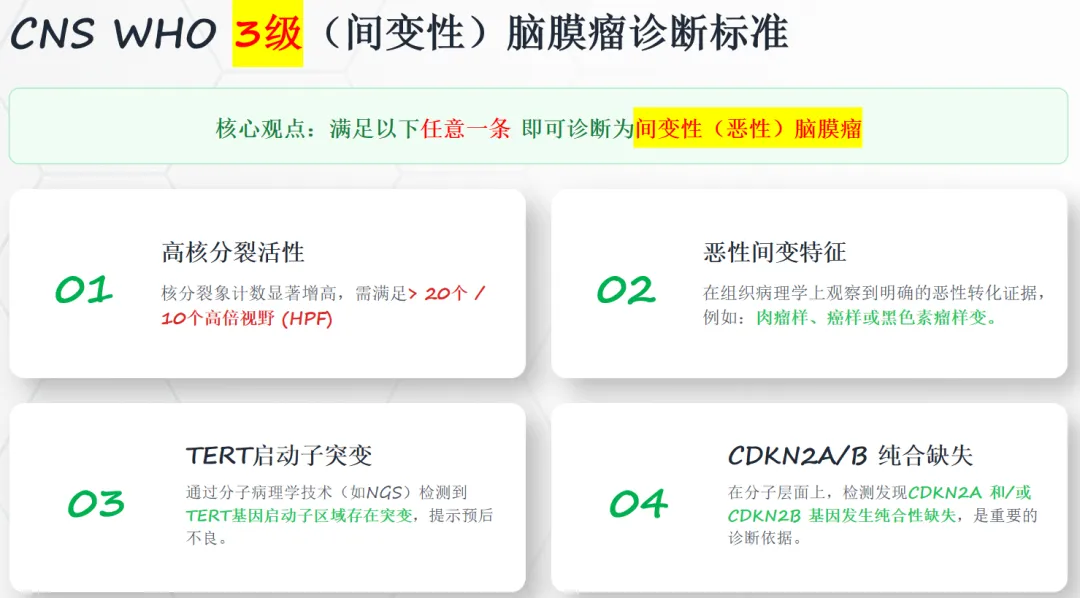 高级别标准:二级、三级脑膜瘤有各自诊断标准,常规加做 Ki67 辅助诊断。