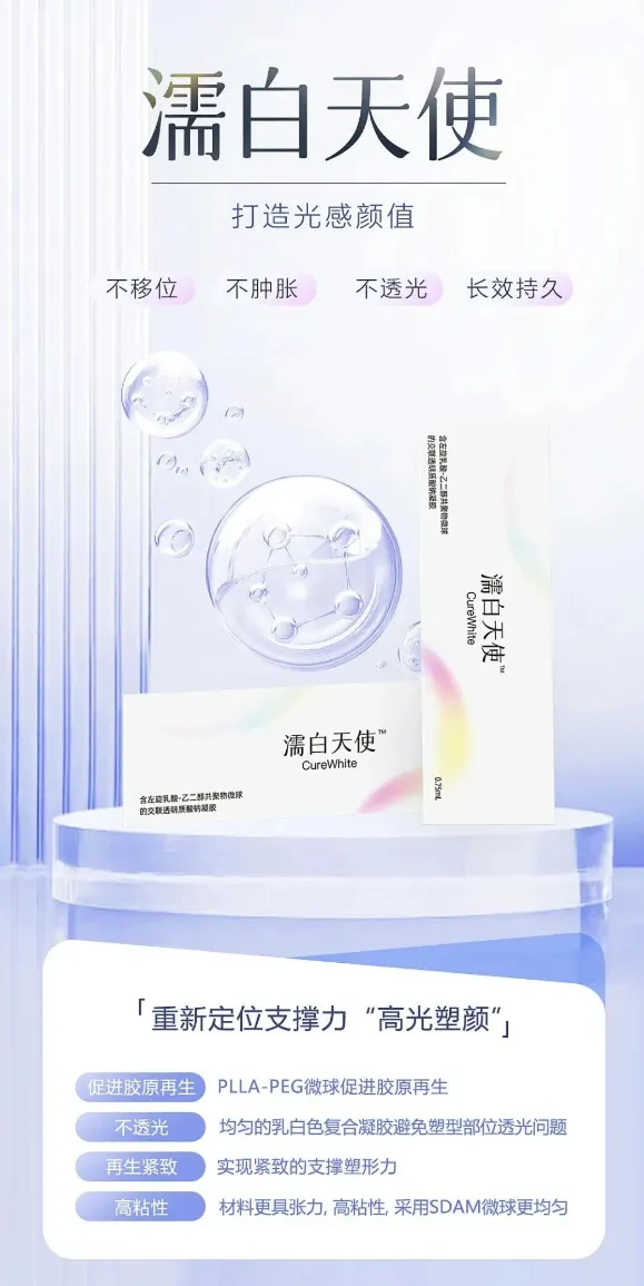 濡白天使由爱美客公司出品,是首款经NMPA批准,含聚左旋乳酸复合微球等成分的乳白色填充剂,具有激活自身胶原再生能力的新一代塑形、提升产品,实现即刻以及自然持久的塑形及提升效果。