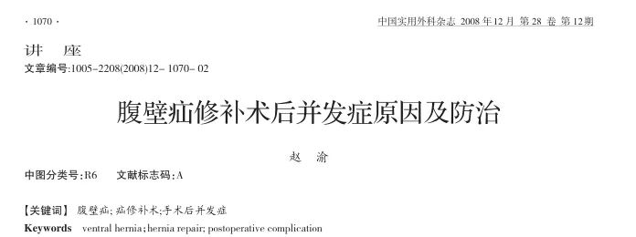 文献来源:赵渝. 腹壁疝修补术后并发症原因及防治[J]. 中国实用外科杂志, 2008, 28(12): 1070-1071.
