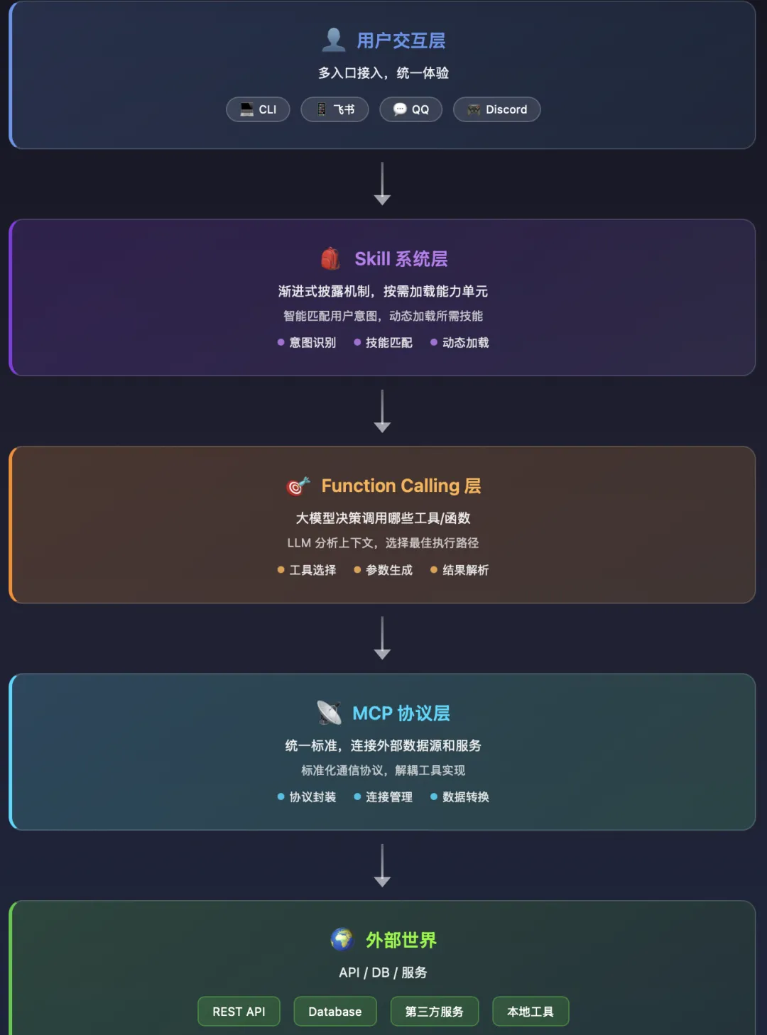 在 AI Agent 开发中,SKILL、Function Calling、MCP、CLI是四个核心概念。它们各自解决不同层次的问题,共同构成了现代 AI Agent 的技术体系。
