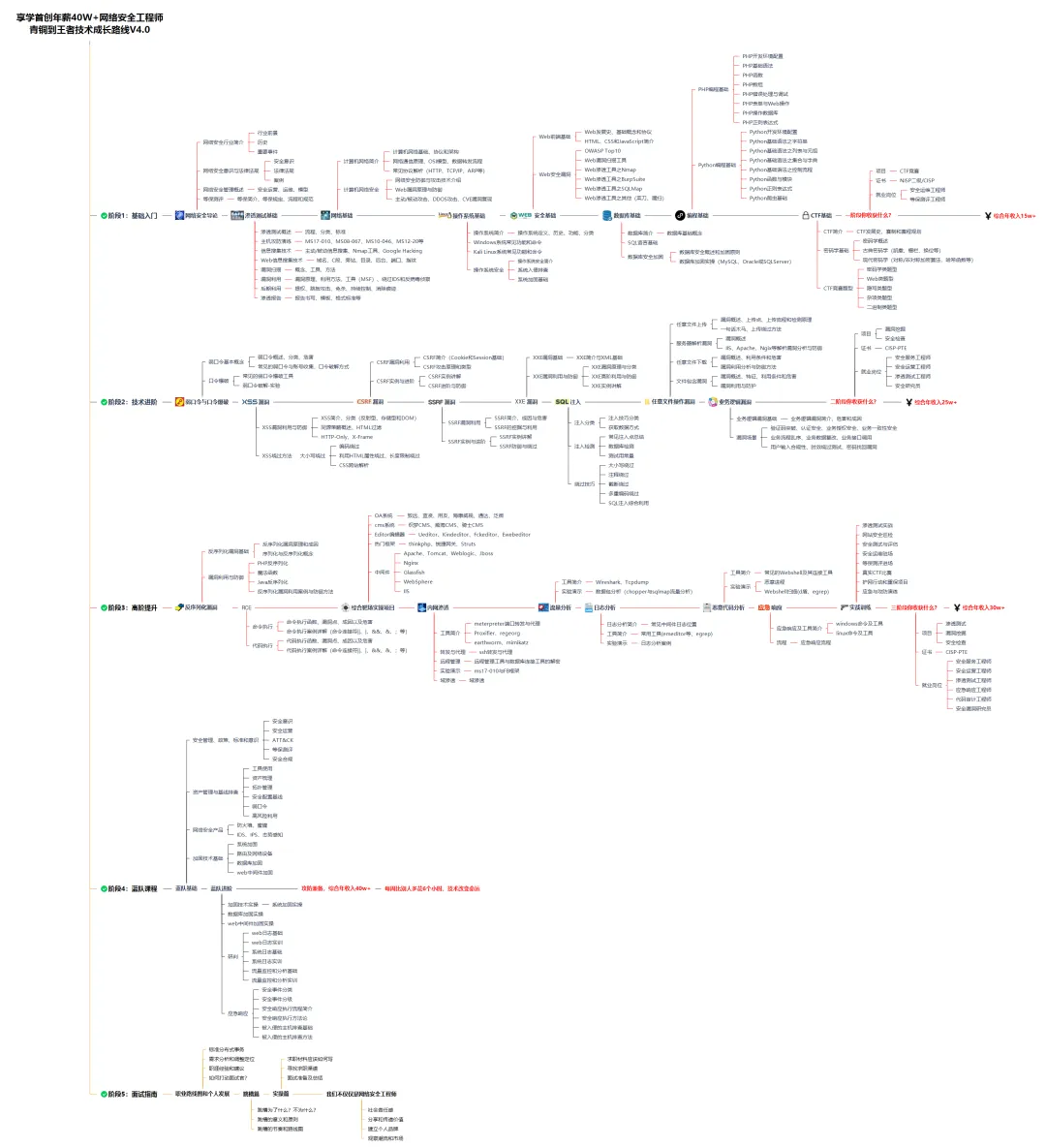对于从来没有接触过网络安全的同学,我们帮你准备了详细的学习成长路线图。可以说是最科学最系统的学习路线,大家跟着这个大的方向学习准没问题。因篇幅有限,仅展示部分资料