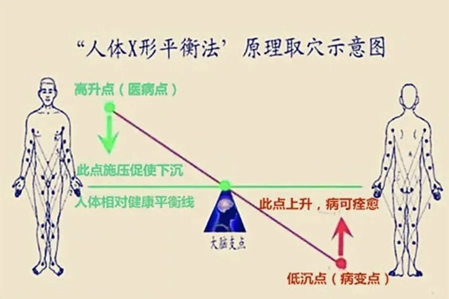 根据人体X形平衡法,人体以大脑为支点,身体处于相对平衡状态。当某处出现病变(低沉点),身体会通过高升点(医病点)发出信号。在高升点施加压力,可促使低沉点上升,从而恢复身体平衡,达到缓解或治疗疾病的目的。