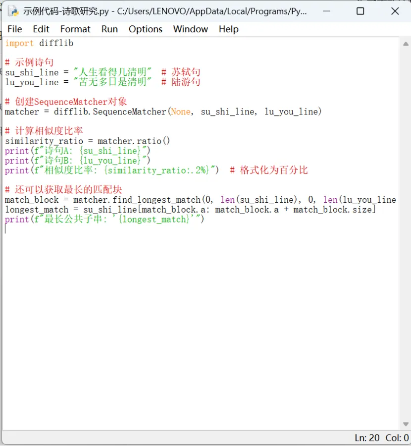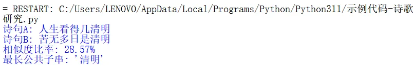 similarity_ratio = matcher.ratio()print(f"诗句A: {su_shi_line}")print(f"诗句B: {lu_you_line}")print(f"相似度比率: {similarity_ratio:.2%}") # 格式化为百分比