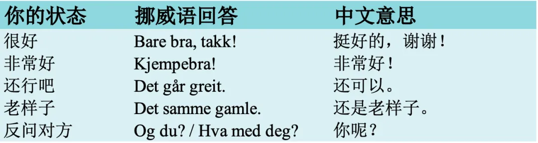 一. 怎么回答挪威人的How are you 呢?请看如下表格