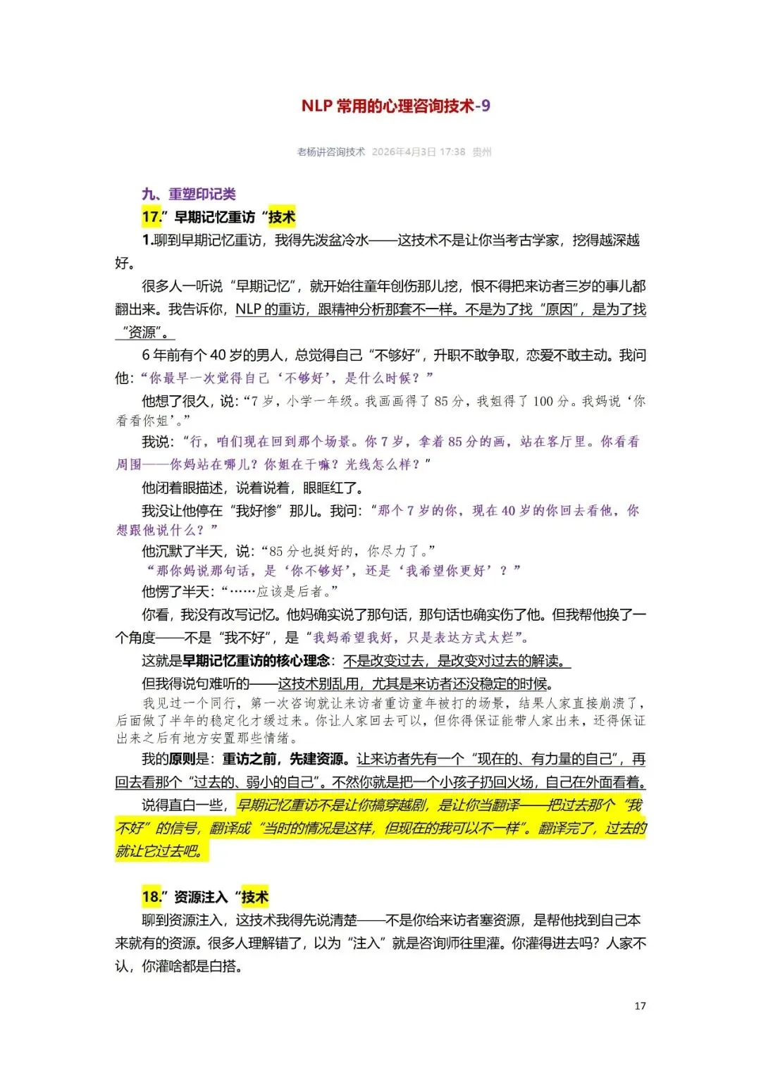 九、重塑印记类:17.”早期记忆重访“技术18.”资源注入“技术