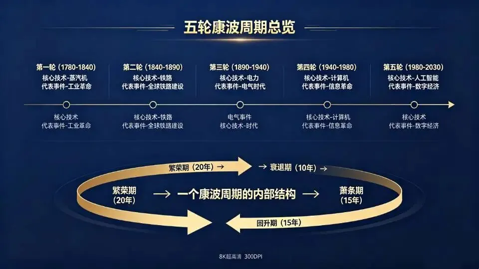 康波周期理论揭示了经济发展的深层规律:技术革命是驱动经济长波的核心力量,繁荣与衰退交替是资本主义的固有特征,财富的积累在很大程度上取决于是否抓住了周期赋予的机会。