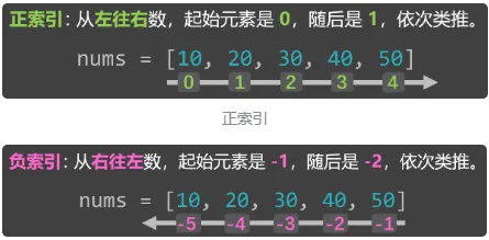 下标又叫索引值,其实就是元素在列表中的“位置编号”,分为:正索引和负索引。