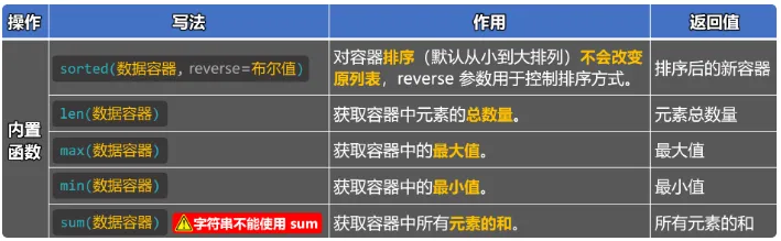 ❝需知:上面列表中的内置函数,不仅只用于列表,而且适用于:所有数据容器。
