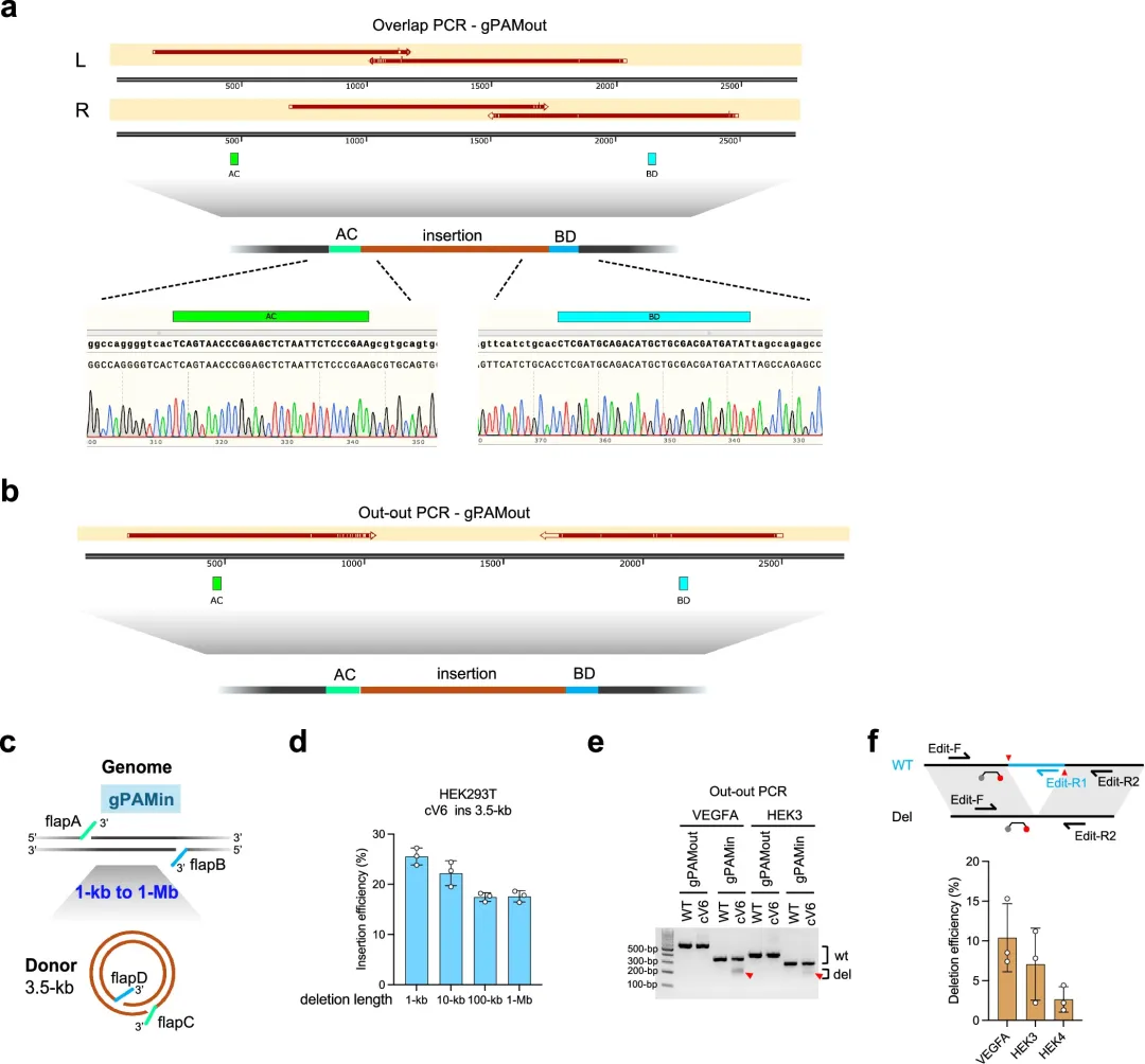 本研究开发了一种名为QuadPE的新型先导编辑系统,通过使用四条经设计的向导RNA(pegRNA)分别靶向基因组和供体DNA,在不产生双链断裂且不依赖外源整合酶或转座酶的情况下,实现了大片段DNA(高达26 kb)在分裂和非分裂细胞(如神经元和T细胞)中的高效、精准插入。