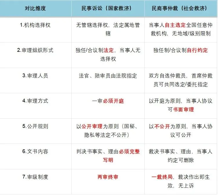 (三)仲裁VS诉讼 核心七大区别(⭐️高频考点)