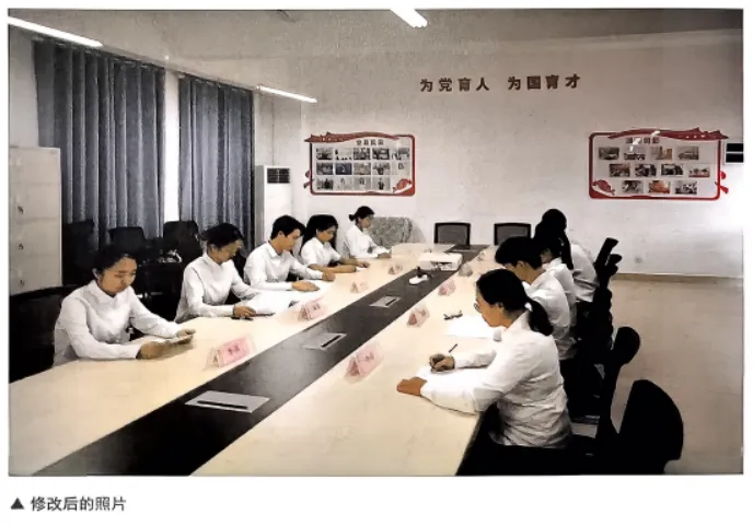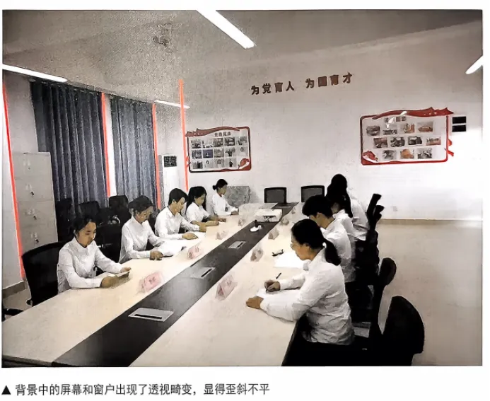 这张图片的水平和纵向透视都有问题,如下图中的箭头所示,会议室中这些纵向的直线本来应该垂直于地面且互相平行,但它们在照片上出现了歪斜。