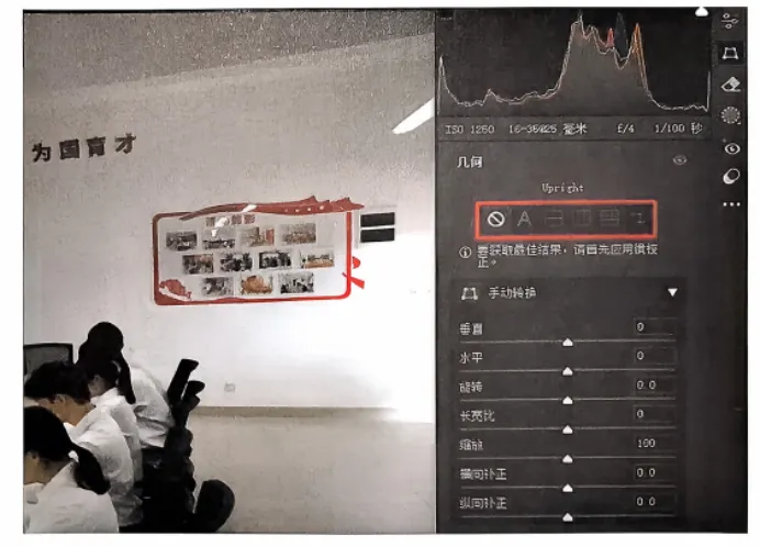 图标,即4号“水平和纵向透视校正”图标,使用水平和纵向透视校正功能,先校正水平线,再校正纵向透视的问题。