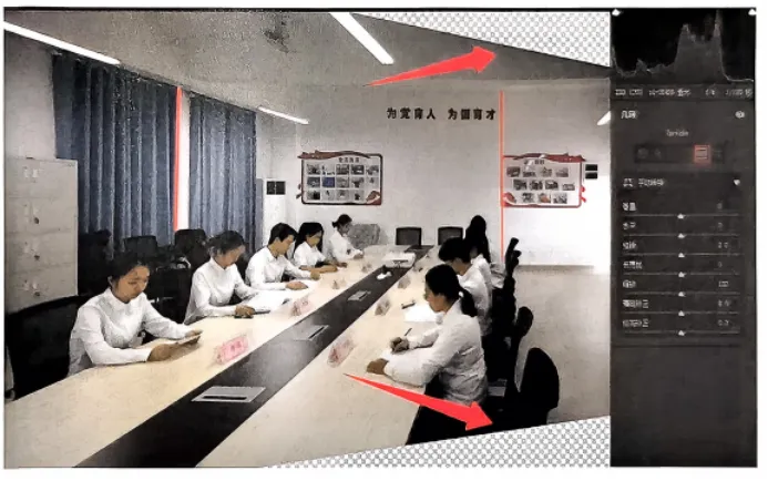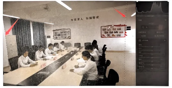 观察前后对比图,横平竖直的会议室显得更加正式和庄严。无论拍摄完的照片是否存在明显的透视畸变或水平歪斜问题,都建议初学者尝试在电脑上用软件进行校正,因为有些细微的歪斜问题用肉眼很难察觉。会议拍摄的风格总归应该是庄严、正式的,任何微小的歪斜都会影响正式感、庄严感和肃穆感。因此,为确保照片的高质量和专业性,在发布前进行一次全面的校正和调整还是很有必要的。