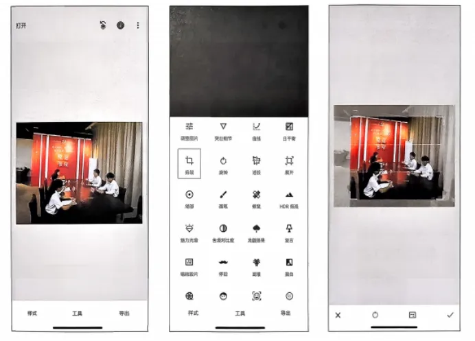 (3)选中照片,将其载入Snapseed主界面,在底部导航栏中会出现样式、工具和导出3个选项。点击“工具”选项,显示各种编辑选项。