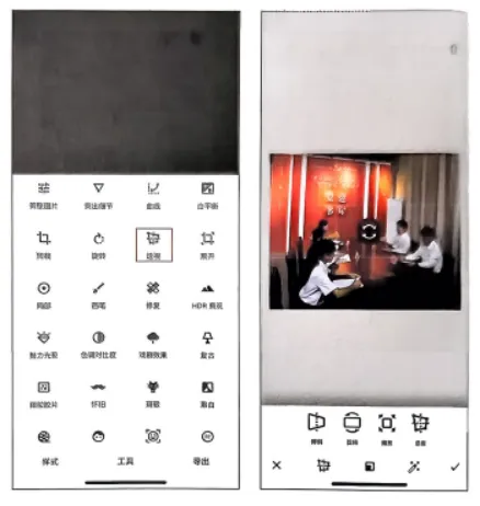 (5)返回“工具”界面,找到并点击“透视”工具。它是调整水平不平或垂直不直等问题的按钮。进入透视调整界面后,下方有“倾斜”“旋转”“缩放”“自由”4个按钮。调整“旋转”按钮。