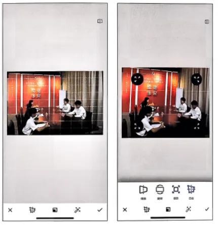 (4) 在“工具”中,找到并点击“裁剪”按钮。先对画面中多余的天花板和杂乱的空间进行裁剪,裁剪结束后点击右下方的对钩标志完成操作。