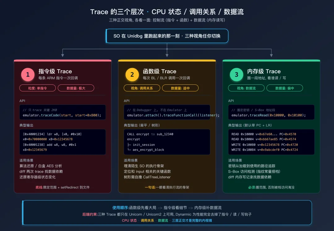 最底层的 Trace。Unidbg 在每条 ARM 指令执行前后,都会回调一次,你能拿到: